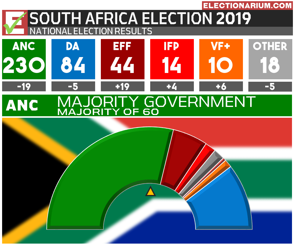 Después de las elecciones del 94, cuando Nelson Mandela y su partido, el ANC, ganaran las elecciones con una mayoría aplastante y acabaran de una vez por todas con el apartheid, esta vez no iba a ser menos; el African National Congress, de ideología cada vez más socialdemócrata, ha vuelto a arrasar en las elecciones, colocando a Cyril Ramaphosa como presidente electo. Aunque el ANC ha vuelto a ganar, no lo ha hecho con la mayoría esperado, y se ha dejado por el camino 19 escaños.