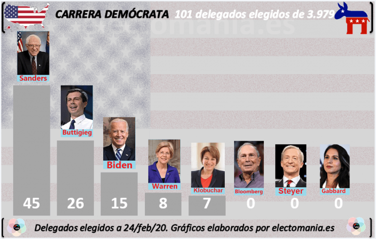 Aún no se sabe nada de Bloomberg, que no se ha presentado a este Caucus y está invirtiendo mucho tiempo en su campaña millonaria para alcanzar un buen dato en el «súper martes» donde se elige el destino Demócrata de muchos estados.