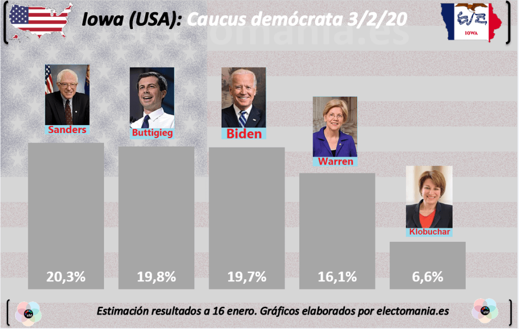 Como se puede ver, se auguraba un empata técnico entre Sanders, Buttigieg y Biden, pero a medida que avanzaba la campaña, Klobucahr fue ganando votos y posibilidades, haciendo perder votos a Biden y Warren, dejando como contrincantes a Sanders y Buttigieg, la primera gran sorpresa para el candidato.