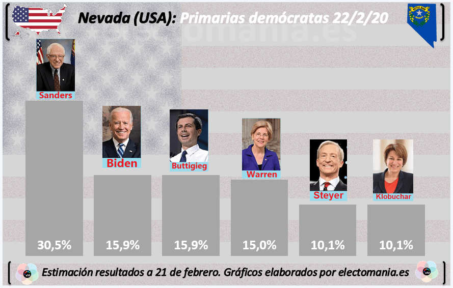 Después de los 2 caucus anteriores, Biden perdió fuelle, que recogió Sanders, que se conviertió en favorito gracias a su aceptación en la comunidad latina. Algo parecido pasó con Buttigieg, que parlotea algo de español y pudo ganar votos por ello. Ascenso de Warren y resurgimiento de Klobuchar, mientras que Steyer sigue ascendiendo, pero más escondido.