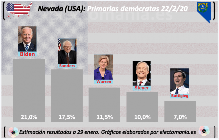 El siguiente estado es Nevada, un estado con una fuerte inmigración latina, por lo que les tocará a los candidatos luchar por el voto extranjero. En estado, pueden haber muchos contrastes de voto entre afroamericanos y latinos, que prefieren a candidatos como Biden para los primeros y Sanders para los segundos, que para los blancos, con clara preferencia por Steyer o Sanders.